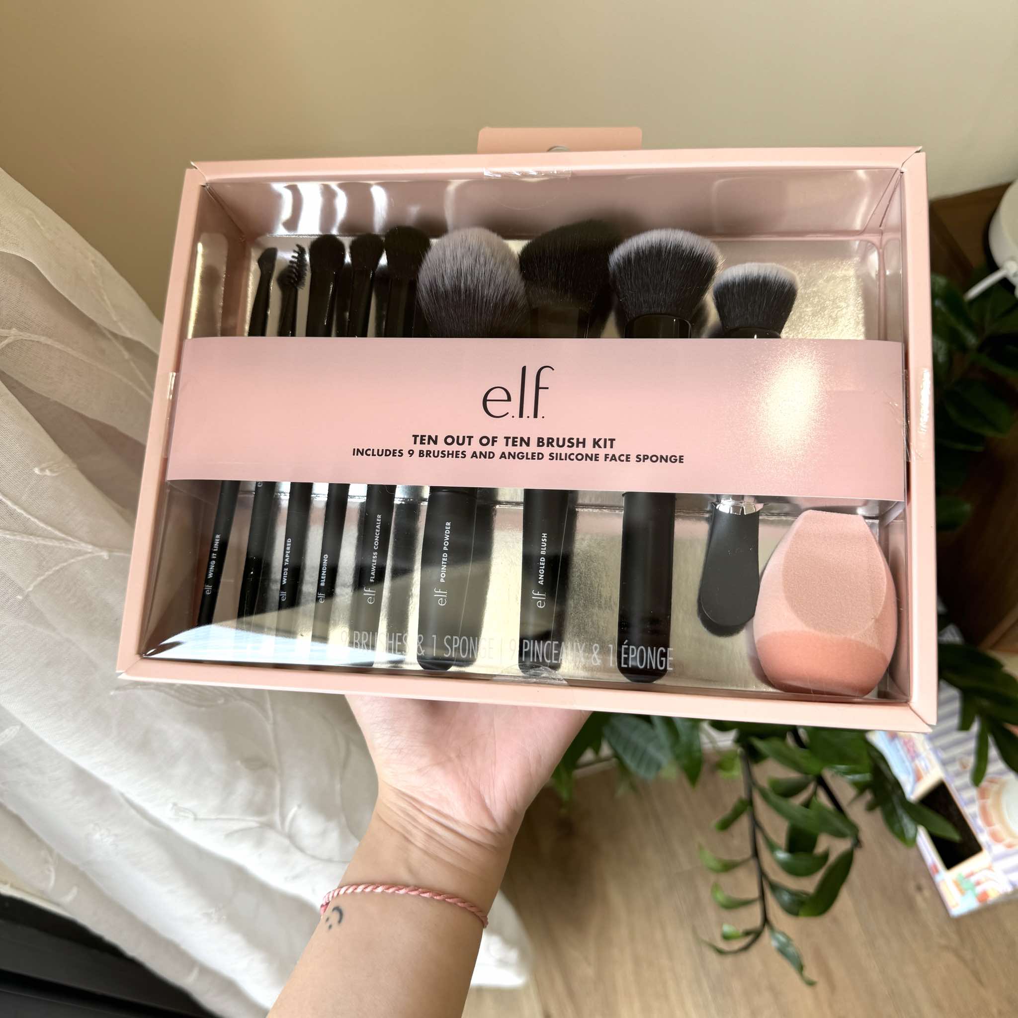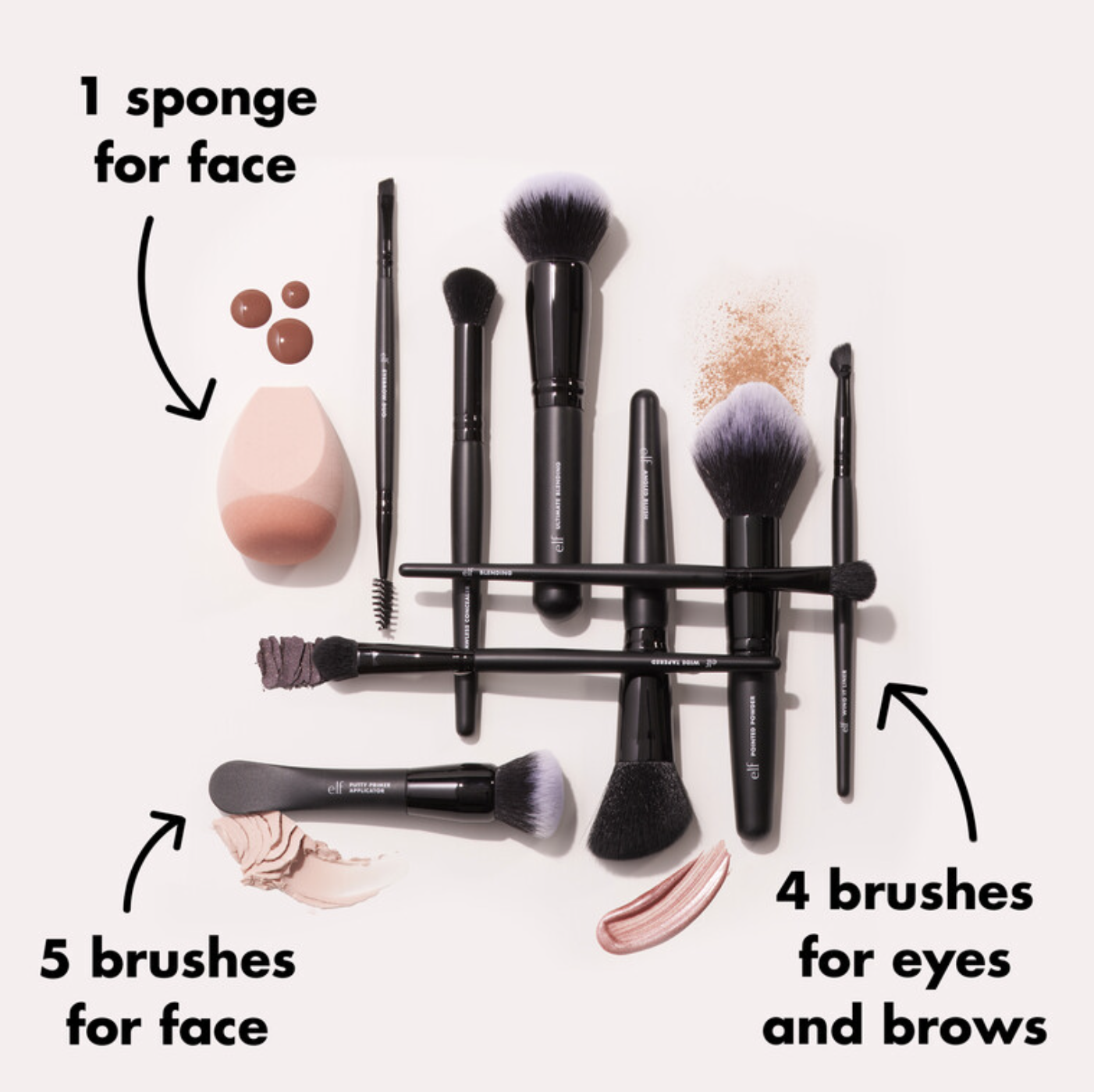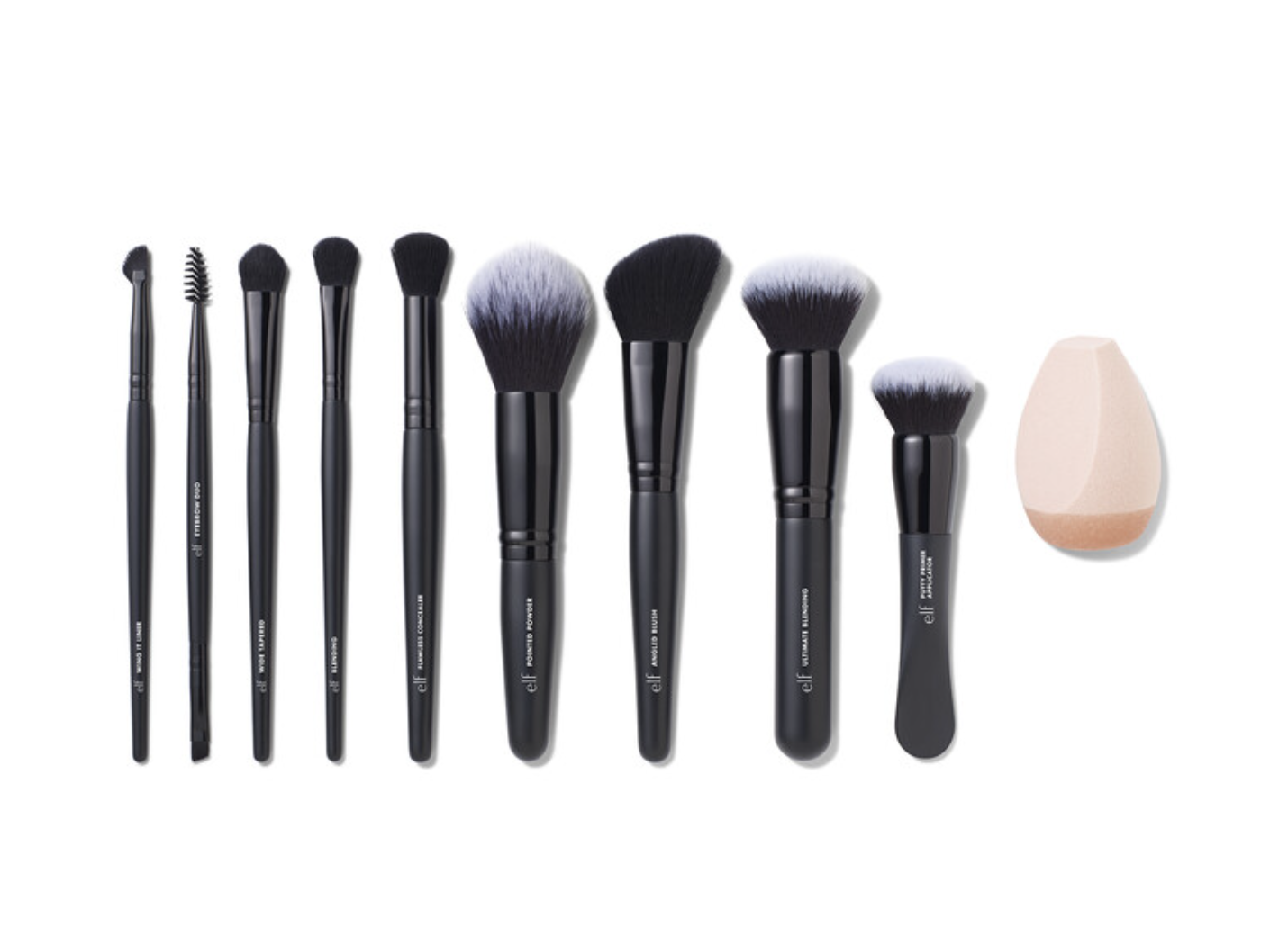 Set 10 cọ trang điểm ELF Ten out of Ten Brush Set gồm 1 mút, 5 cọ cho mặt và 4 cọ cho mắt, lông mày.